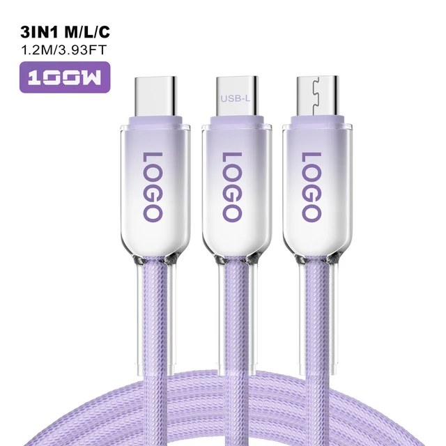 1.2M 3.94FT 100W 3in1 5A Charging Cable Data Cord Fast Charging Line Micro USB Type-C Connector for iphone 16 Samsung Huawei