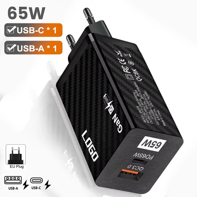 OEM LOGO GaN65W Cargador de carga rápida 3,0 Tipo C PD Adaptador de fuente de alimentación de teléfono USB portátil para cargadores de computadora portátil IPhone 17 Pro