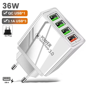 European EU PLUG 36W 4-Port Wall Fast Charger UK Power Adapter with 36W Intelligent QC3.0 Multiple USBA Charging for iPhone 16