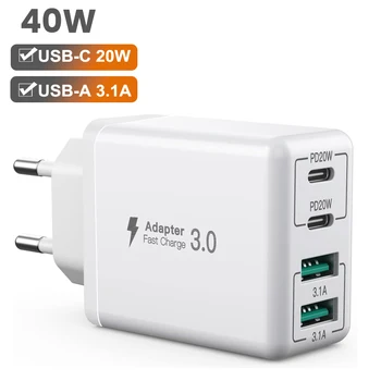 EU US UK USB C Wall Charger 40W 4-Port USB C Charger Fast Charging Dual Port PD+QC Wall Type C for iPhone 17 Samsung PhoneTablet