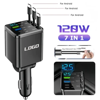 7-In-1 Car Phone Fast Charger Three Retractable Cables Quick Charging 180° Directional Adjustment LED Digital Display