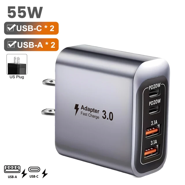 55w अमेरिकी यात्रा हमें प्लग यूएसबी सी 55w यूएसबी सी यूरोपीय चार्जर 4-पोर्ट फास्ट चार्जर टाइप सी दीवार चार्जर
