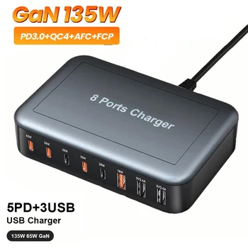 EONLINE 3D 135W GaN Charging Station 8-port PD Charger USB C Fast Charger PD65W 35W PD3.0 18W QC3.0 for MacBook Phone 14 Samsung
