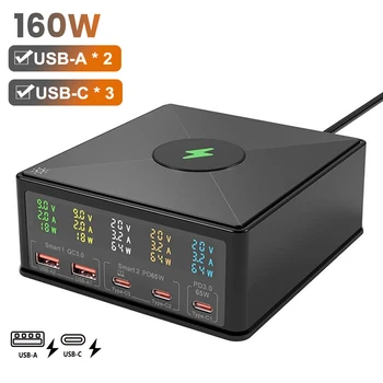 Eonline 160W GaN USB-C Power Adapter LED Display Wireless Charger Station 5-Port PD65W and QC3.0 USB Fast Charging for iPhone IP